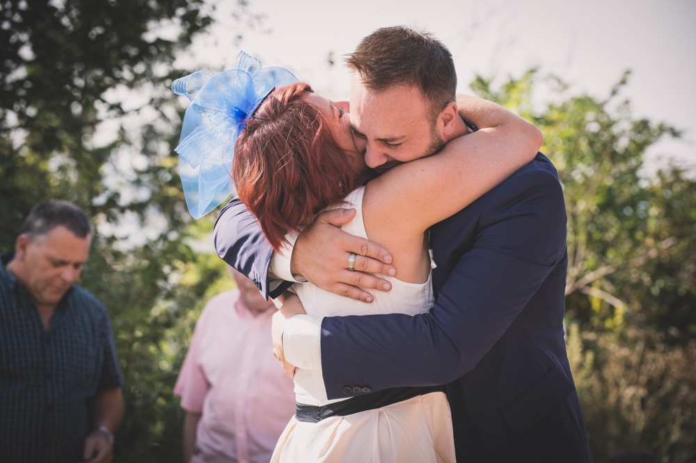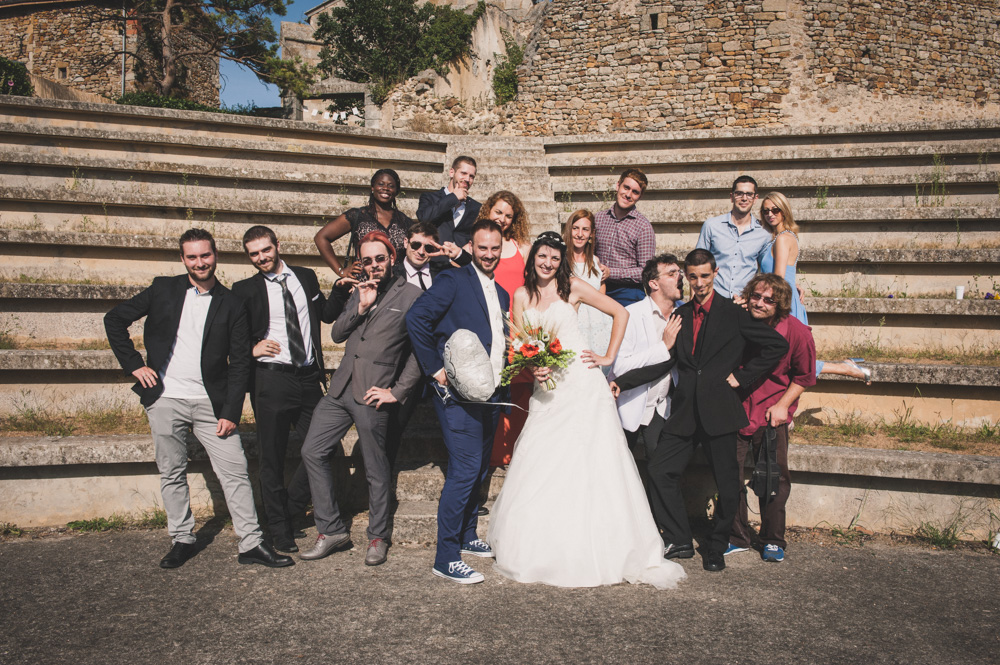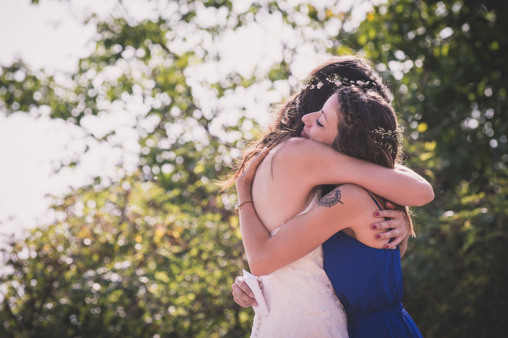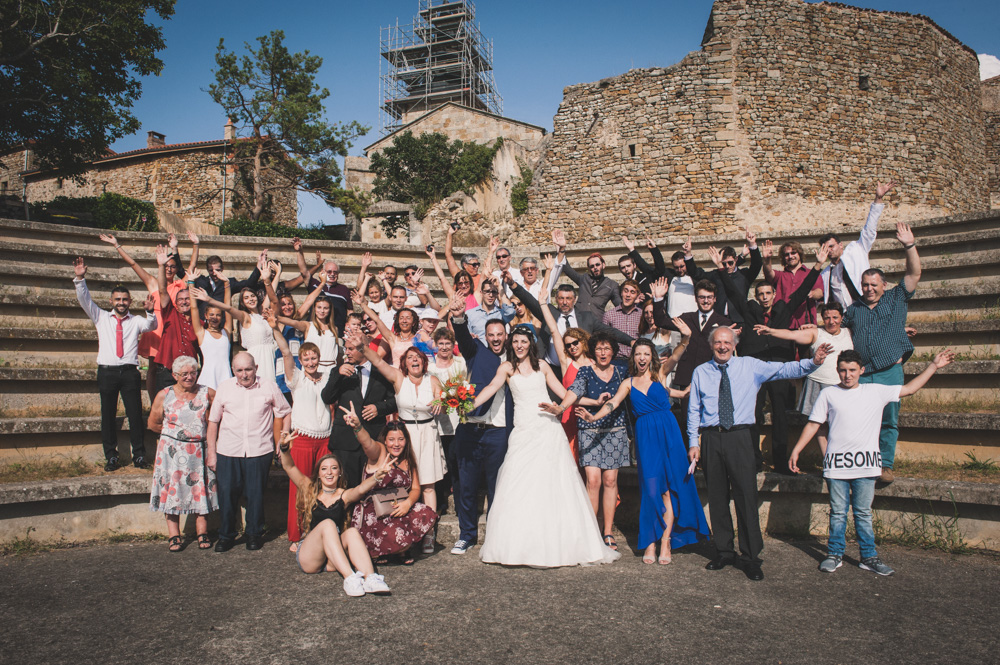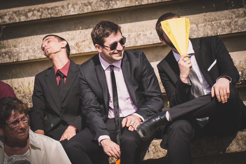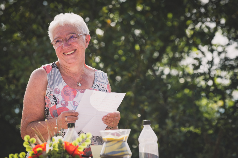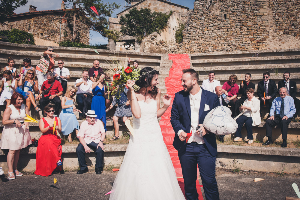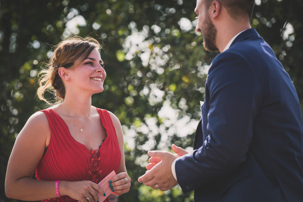 Après le passage à la mairie, ils ont choisi une cérémonie laïque en extérieur, dans un amphithéâtre. La chaleur écrasante du mois d’août ne viendra pas gâcher leur mariage ! Leurs proches se succèdent devant eux.